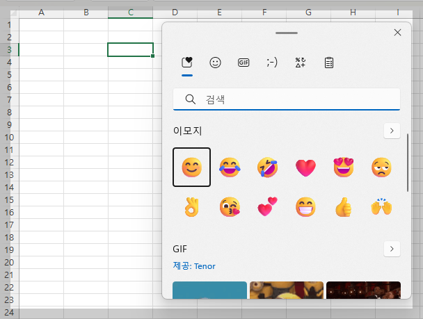 엑셀에서 이모티콘을 넣고 싶은 셀을 선택한 후, 키보드에서 윈도우키와 마침표(.)를 동시에 누르면 이모지 입력창이 뜹니다. 여기서 원하는 이모티콘을 선택하면 셀에 삽입됩니다. 다만, 엑셀 셀에서는 이모지가 컬러가 아닌 흑백 형태로 표시됩니다.