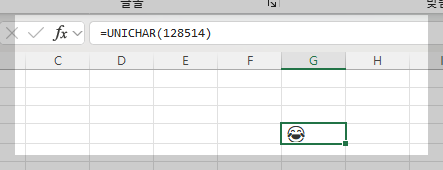 유니코드 번호를 알고 있다면 =UNICHAR(유니코드번호) 함수를 사용해 이모티콘을 삽입할 수 있습니다. 예를 들어 =UNICHAR(128514)는 😂 이모티콘을 표시합니다. 이 방법도 색상은 흑백으로 표시됩니다.