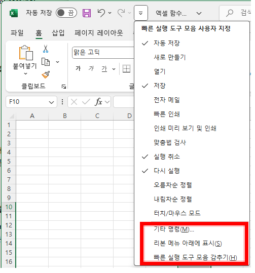 - 빠른 실행 도구 모음 오른쪽의 ▼(아래 화살표) 클릭 → 자주 쓰는 명령에 체크하거나 [기타 명령] 선택 후 Excel 옵션 창에서 더 다양한 명령 추가