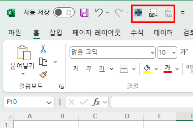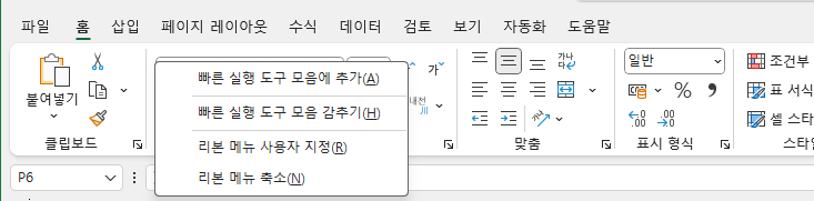 - 리본 메뉴에서 원하는 명령에 마우스 오른쪽 버튼 클릭 → [빠른 실행 도구 모음에 추가] 선택