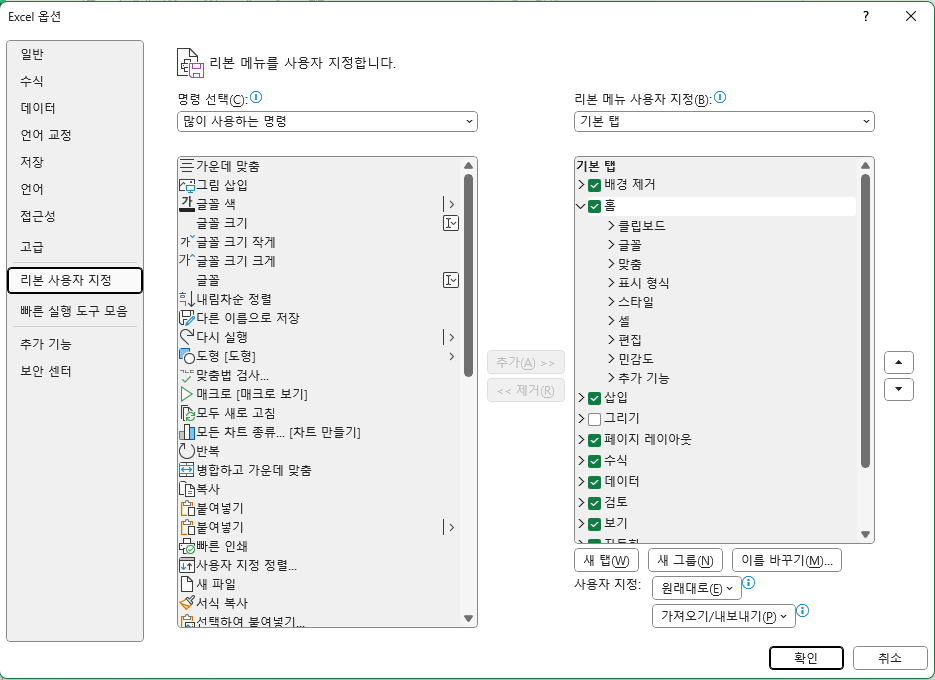엑셀 리본메뉴는 [파일] → [옵션] → [리본 사용자 지정] 또는 리본 위 마우스 오른쪽 클릭으로 진입하여, 탭/그룹/명령을 추가·삭제·순서변경·이름변경 할 수 있습니다. 원하는 구성을 마친 뒤 [확인]을 누르면 즉시 반영되어, 본인만의 효율적인 작업 환경을 만들 수 있습니다.