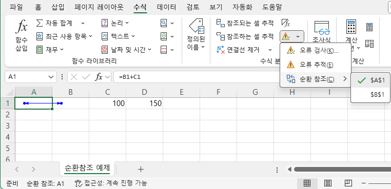 - 수식 탭 → 오른쪽의 오류 검사 ▼ 클릭 → ‘순환 참조’ 메뉴 확인