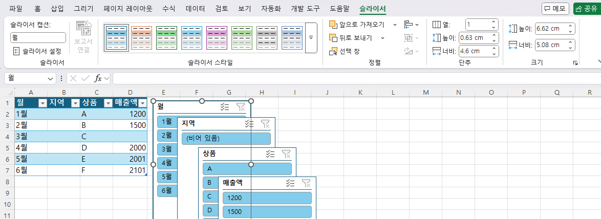 여러 슬라이서를 선택한 뒤 [서식] 탭에서 ‘높이 맞춤’, ‘너비 맞춤’ 등으로 크기를 통일하면, 시각적으로 정돈된 느낌을 줄 수 있습니다. - 피벗테이블과의 간격: