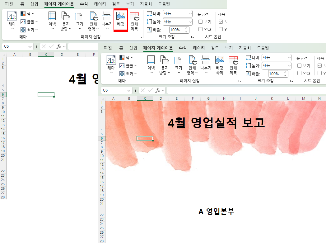 | 페이지 레이아웃 > 배경 | 시트 전체 | 불가 | 불가 | 타일 형태 반복, 화면 전용 |