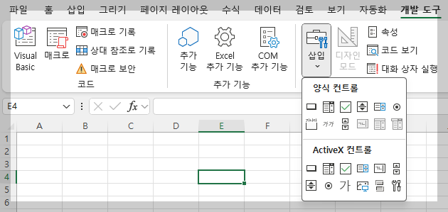 • [개발 도구] → [컨트롤] → [삽입] → [양식 컨트롤] → [체크박스]를 선택 후, 원하는 위치에 드래그해서 생성할 수 있습니다.