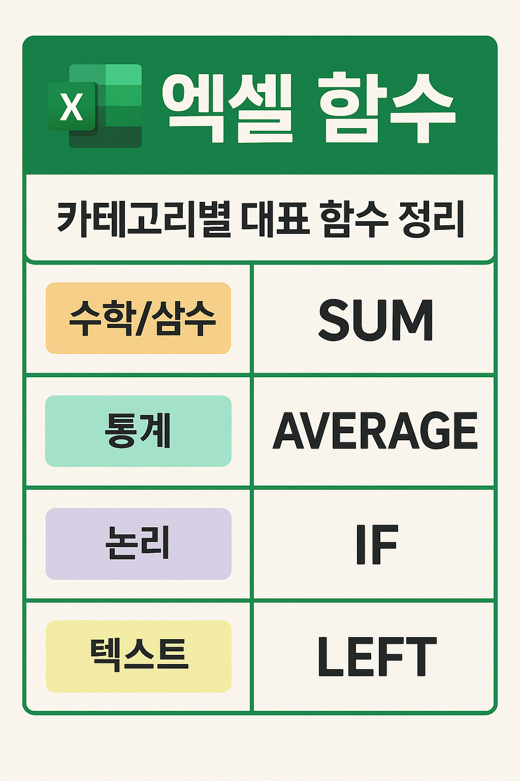 엑셀에서 자주 사용하는 함수들을 카테고리별로 정리한 표입니다.