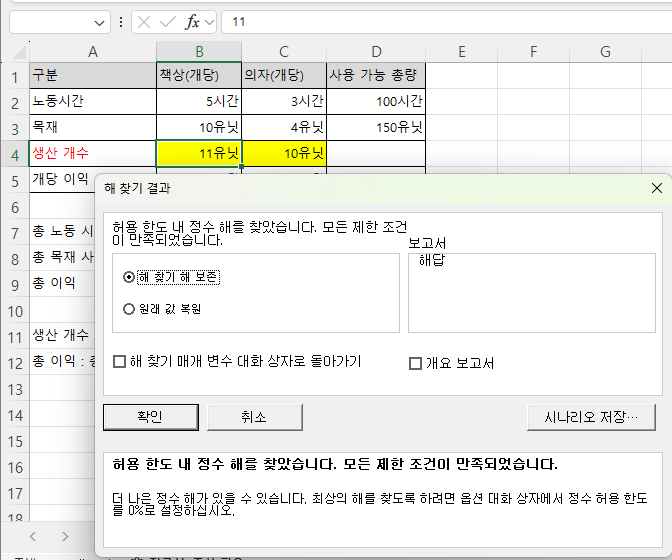 6. '해를 찾을 수 없음' 결과가 나올 수 있습니다.
