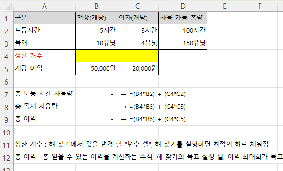 ● 제약 조건 셀도 수식으로 연결: 제약 조건에 사용되는 셀(예: 총 노동 시간 사용량) 역시 변수 셀에 따라 값이 바뀌는 수식으로 연결되어 있어야 합니다.