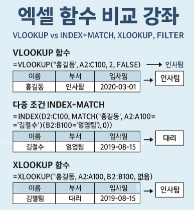 VLOOKUP, INDEX+MATCH, 다중조건 INDEX+MATCH, XLOOKUP 비교