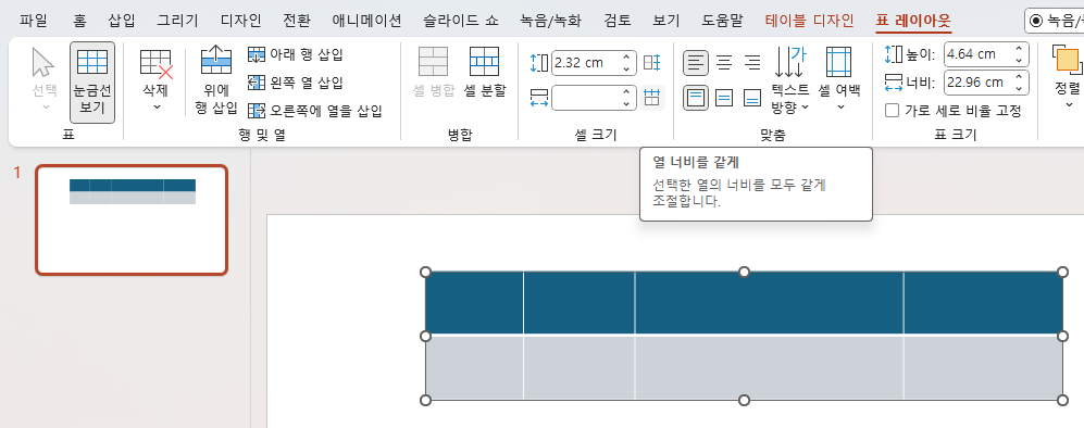 - 행 높이를 같게, 열 너비를 같게 버튼을 클릭하면 선택한 행 또는 열의 크기가 자동으로 동일하게 조정됩니다.
